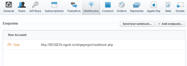 4) You can set up this url http://f253021b.ngrok.io/stripeproject/webhook.php to send test webhooks to your integration’s endpoint within your account’s webhooks settings.